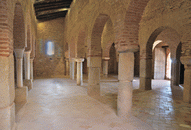 Al interior se accede por una puerta en el lado de Levante, que consta de un pórtico con arco rebajado al exterior, y una puerta adintelada por la que se llega al patio o SHAN, donde se encuentra LA FUENTE DE LAS ABLUCIONES . La organización interna presenta una estructura basilical con el espacio dividido en cinco naves orientadas de Norte a Sur hacia el MIHRAB, y separadas por arcos de ladrillo que apean sobre soportes de distinta naturaleza. En el muro de la QUIBLA se abre el MIHRAB, de planta semicircular, acusada al exterior cubierto con bóveda de horno y directriz de herradura. La embocadura la constituye un arco de herradura con Alfiz. Es datable entre los años 920-960, por lo tanto uno de los más viejos del Islam Occidental. En la parte más alta del cerro se levanta el ALMINAR, de planta rectangular y formado por tres cuerpos. El inferior, macizo alberga una escalera de caracol, desarrollada en torno a una machón central que originariamente era cilíndrico. Este cuerpo es del S.X.